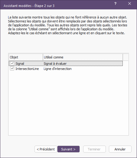 4.Dans la colonne Utilisé comme, vous pouvez modifier le texte qui s'affiche lorsque le modèle est utilisé. Saisissez le texte Signal à évaluer pour l'objet Signal et le texte Ligne d'intersection pour l'objet IntersectionLine. Cliquez sur Suivant.