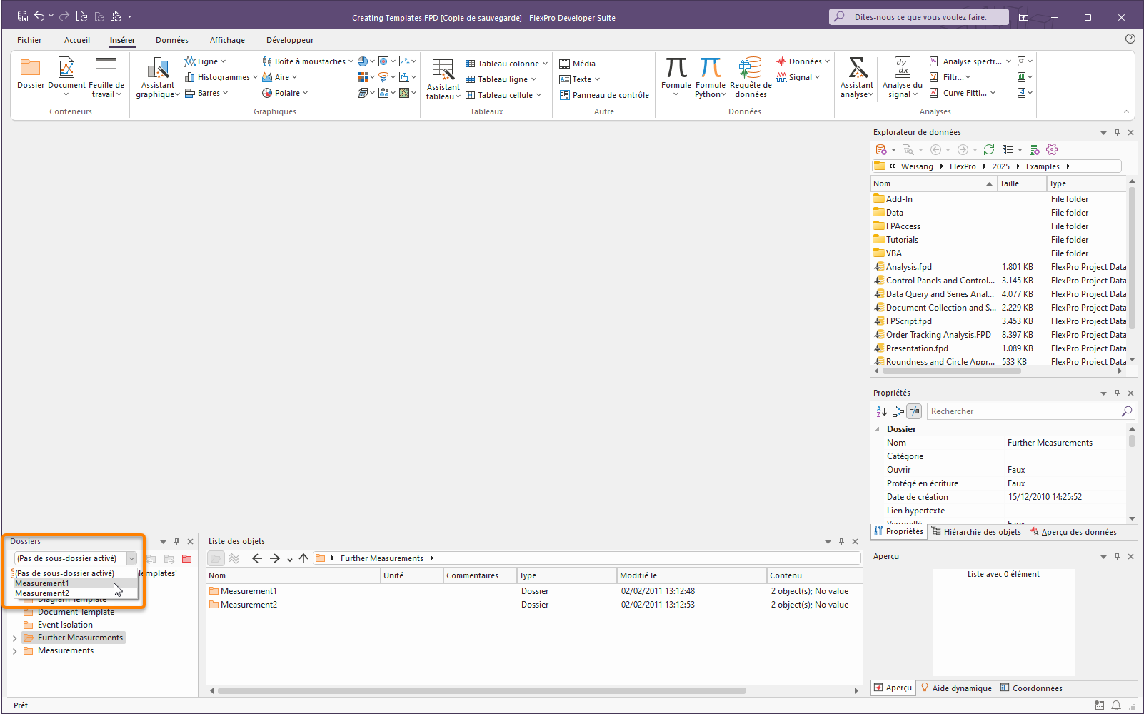 1.Dans la liste d'objets ou dans la fenêtre Dossiers, ouvrez le dossier Mesures et sélectionnez les dossiers Mesure1 et Mesure2.
