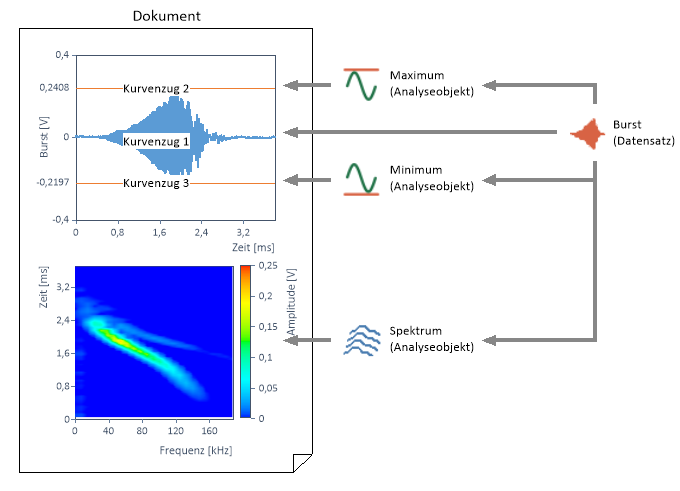 Einmal erstellte Analysen können Sie als Analysevorlage in der aktuellen Datenbank oder einer Vorlagendatenbank speichern. Eine solche Analysevorlage besteht aus einem beliebigen Netzwerk von voneinander abhängigen Objekten. Im obigen Beispiel wären diese das Dokument, die darin enthaltenen Diagramme und die drei Analyseobjekte. Objekte der untersten Hierarchieebene, d. h. solche, die von keinem anderen Objekt abhängig sind, werden bei der späteren Anwendung der Vorlage durch markierte Objekte ersetzt, sofern sie nicht bei der Erstellung der Vorlage als dieser zugehörig markiert wurden. Im obigen Beispiel wäre dies der Datensatz. Es können jedoch auch beliebige andere Objekte sein, z. B. ein Diagramm. Die Analysevorlagen können Sie die dann im Analyse-Assistenten zur Erstellung neuer Analysen verwenden oder direkt beim Datenimport auf die neu importierten Daten anwenden.