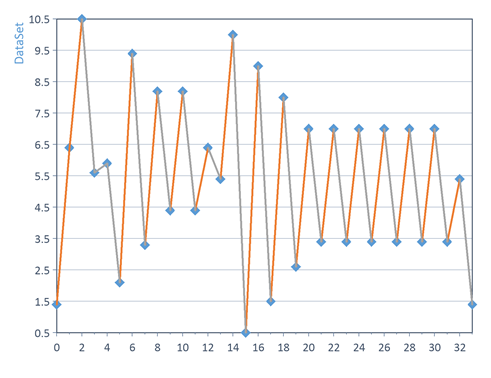 Die Typen von DataSet und ClassLimits sollten gleich sein. Ist dies nicht der Fall, werden diese einander angepasst. Wenn als Datensatz eine Datenreihe angegeben wurde, ist das Ergebnis eine Datenmatrix von 64-Bit Ganzzahlwerten mit der Markov-Matrix. Die Zeilen der Matrix (Index in X-Richtung) entsprechen den "von"-Klassen der Übergänge und die Spalten den "nach"-Klassen. Wenn DataSet als Signal angegeben wurde, ist das Ergebnis eine Signalreihe mit Z-Komponente, deren X- und Z-Komponente die aus Klassengrenzen resultierenden Klassenmitten enthalten.