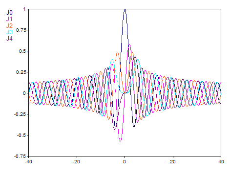 Für ein reelles Argument wird die reelle Bessel-Funktion berechnet. Das Ergebnis hat dann den Datentyp 64-Bit Fließkommazahl. Folgende Grafik zeigt den Verlauf der Funktion für die Ordnungen 0 bis 4 im Intervall [-40, 40]: