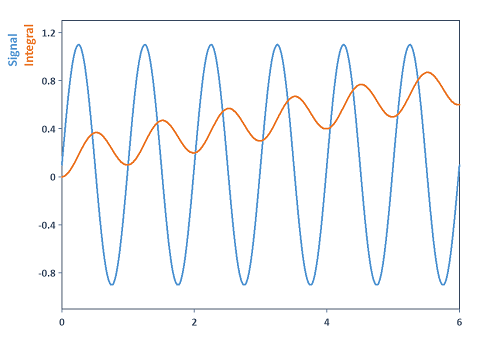 Die Einheit des Ergebnisses ist gleich dem Produkt der Einheiten der Y- und X-Komponente von Signal. Die Werte werden vor der Berechnung in 64-Fließkommazahlen gewandelt. Bei Datenmatrizen und Signalreihen erfolgt die Berechnung spaltenweise. Die X- bzw. Z-Komponenten werden, falls vorhanden, unverändert in das Ergebnis übernommen. Das Ergebnis kann als Stammfunktion des Signals betrachtet werden.