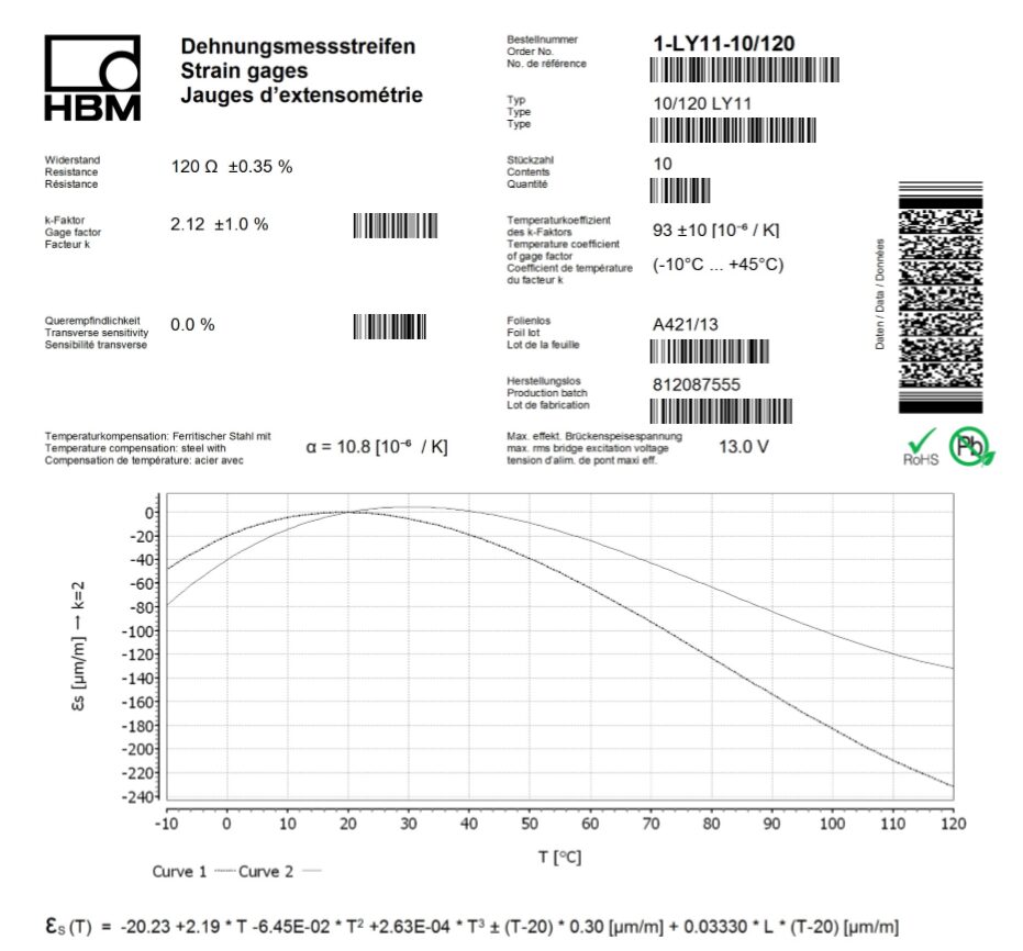 Neben der Polynomialfunktion beinhaltet die verwendete Formel die Temperaturabhängigkeit des k-Faktors und eine zusätzliche Berücksichtigung einer Abweichung zwischen dem thermischen Ausdehnungskoeffizienten des Werkstoffmaterials, an dem die Messung durchgeführt wurde, und dem thermischen Ausdehnungskoeffizienten des DMS-Gitterwerkstoffs. Für die Temperaturkompensation wird folgende Formel verwendet:
