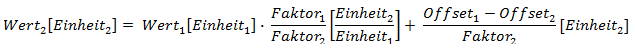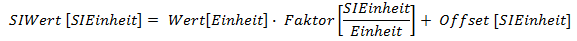 •einen Offset, der einen Versatz zwischen der Einheit, in der die Größe vorliegt, und der entsprechenden SI-Basiseinheit darstellt (z. B. 1 °C = (1 + 273,15) K).