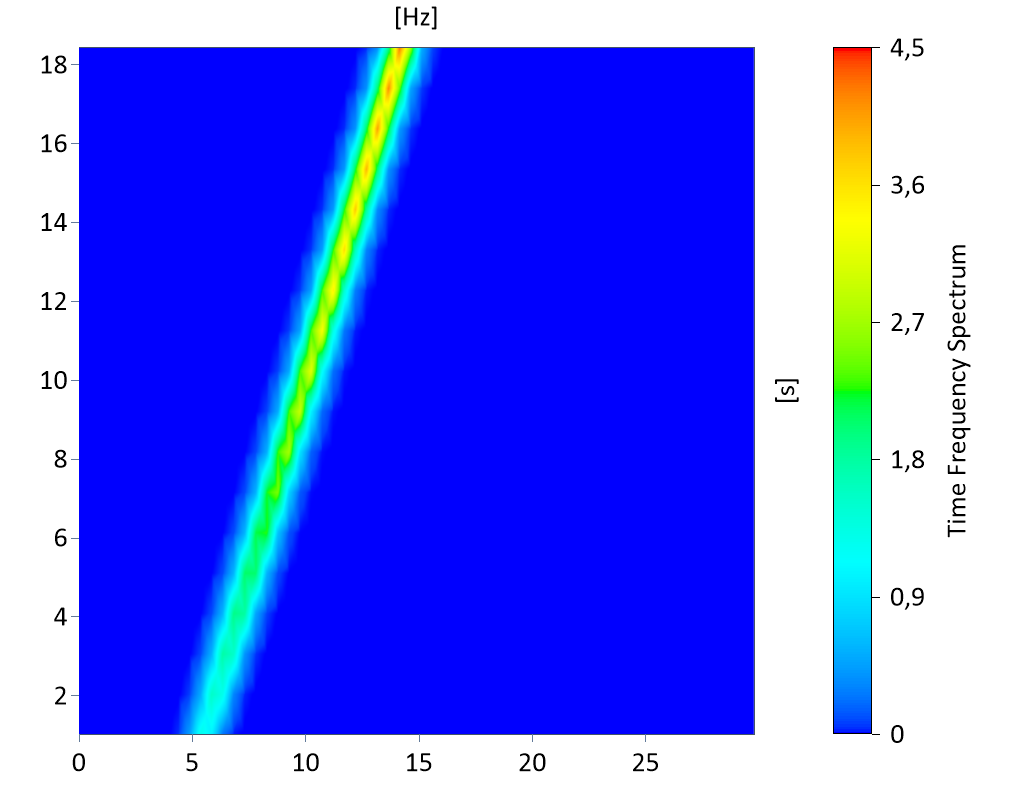 Das Zeit-Frequenz-Spektrum des skalierten Signals liefert (visualisiert in einem 3D-Konturdiagramm):
