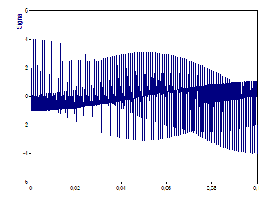 Der X-Wert (Zeit) variiert von 0 bis 0,1 bei einer Schrittweite von 0,0001. Die Nyquist-Frequenz ist somit 5000 (Hälfte der Abtastfrequenz von 10000). Die vier Referenzsinuskurven erstrecken sich über den Nyquist-Bereich. Die erste Sinuskurve mit geringer Leistung (-40 dB) hat 1 % der Amplitude der Referenzsinuskurven und 0,01 % Leistung von einer der Refererenzsinuskurven. Die zweite Sinuskurve geringer Leistung (-50 dB) hat 0,001 % der Leistung der Referenzkurven. Die letzte Testkurve (-60 dB) hat nur 0,1 % der Amplitude und 0,0001 % der Leistung der Referenzkurven. Gauss-Rauschen (bei 0,15 %) wurde hinzugefügt, um ein Hintergrundrauschen bei ungefähr -75 dB zu erzeugen. Es sollte folglich möglich sein mittels geeigneter Spektralanalyse sogar die -60 dB Komponente auswerten zu können.
