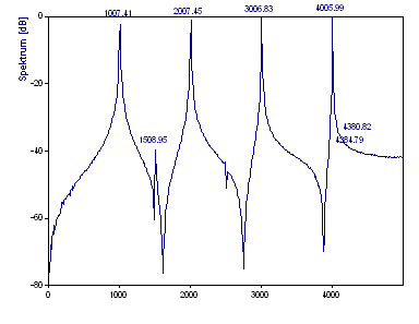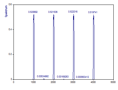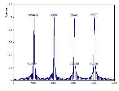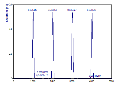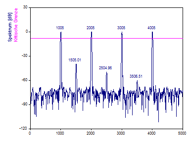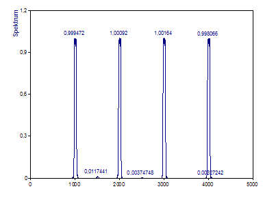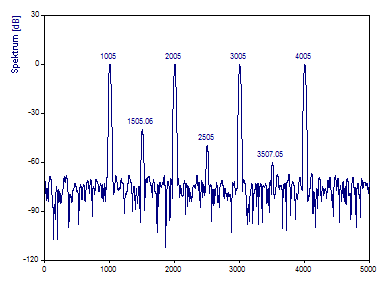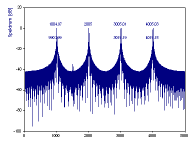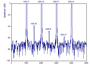 Beachten Sie, dass die tatsächliche Frequenz des ersten Peak mit dem Wert 1005 innerhalb der FFT-Frequenzlinien 999 und 1009 untergebracht sein muss. Die Frequenz 4005 des vierten Peaks kann größtenteils in der FFT-Frequenzlinie 4006 untergebracht sein. Nur wenn eine Frequenz genau auf eine Frequenzlinie fällt, kann eine harmonische Komponente durch einen einzelnen FFT-Kanal repräsentiert werden.