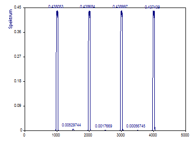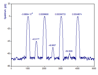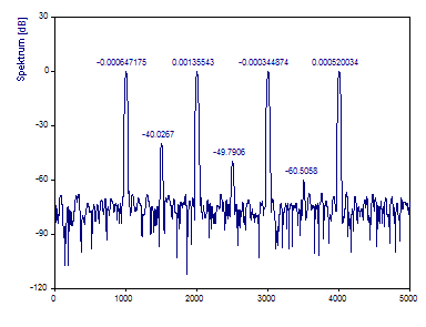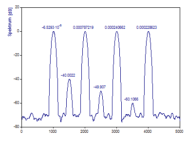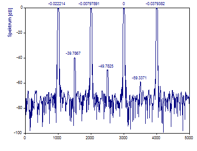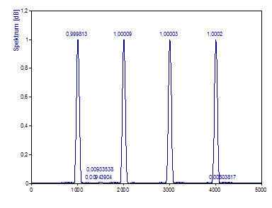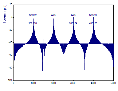 Die FFT-Berechnung verwendet den schnellst möglichen FFT-Algorithmus, der die Daten exakt transformiert. In diesem Fall wird der Primfaktor-FFT-Algorithmus verwendet, da es sich um die schnellste FFT-Prozedur handelt, die den Datensatz mit den 1001 Werten berechnet. Das erzeugte Fourier-Spektrum erfasst die vier Referenzpeaks. Der -40 dB Peak wird abgebildet. Es gibt nur eine Andeutung des -50 dB Peak und kein Anzeichen vom -60 dB Peak. Obwohl die Frequenzen der Peaks im Spektrum mit einer kubischen Spline-Interpolation zentriert werden, werden die Bezugsfrequenzen 1005, 2005, 3005 und 4005 nicht exakt wiedergegeben.