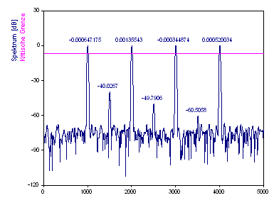 Beachten Sie, dass dieser Algorithmus eine interne Interpolation verwendet, die nicht frei von Fehlern ist. Die Sinuskurven der Daten sind ohne Rauschen angelegt und trotzdem wird ein Hintergrundrauschen von ungefähr -25 dB angezeigt. Dies beschränkt die Einsatzmöglichkeiten dieser Prozedur für eine Fourier-Analyse mit hohem Dynamikbereich.