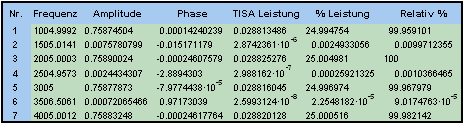 "HarmonischeAnalyse" ist eine Tabelle mit den Spektralinformationen für die sieben Spektralkomponenten, festgelegt durch die maximale Peak-Anzahl von 7. Diese Tabelle zeigt Frequenz, Amplitude, Phase und TISA-Leistung. Bei "% Leistung" liefert die Summe aller Komponenten 100 %, die Werte der Spalte "Relativ %" ordnen die 100 % der Komponente mit der größten Leistung zu.