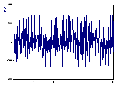Hier sehen Sie die Darstellung des Signals mit 1000 Fließkommawerten. Die X-Werte liegen aufsteigend im Bereich von 0 bis 10, weisen jedoch kein konstantes Abtastinterval auf. Es handelt sich um ein "Worst-Case" Szenario für den Fourier-Algorithmus für nicht-äquidistant abgetastete Daten.