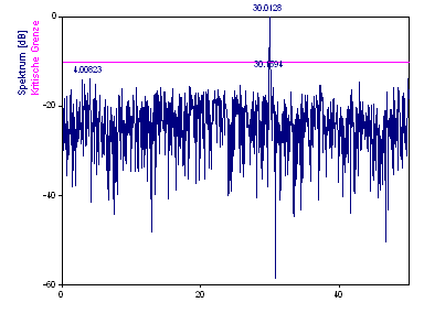 Das Diagramm "Spektrum" ist die Darstellung des Fourier-Spektrums, das durch den Analyseassistenten erzeugt wurde. Es verwendet die Objekte "Spektrum", "Kritische Grenze" und "Peaks".