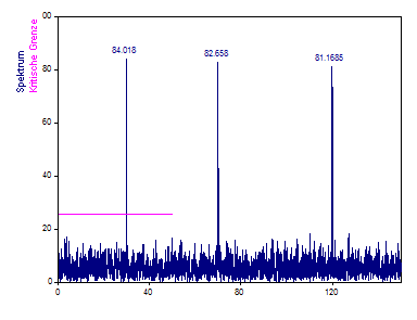 FlexPro bietet Peak-basierte kritische Grenzen, um zu bestimmen, ob ein Peak statistisch bedeutsam ist oder nicht. Die Referenz ist weißes (normalverteiltes) Rauschen. Eine 95 % kritische Grenze ist das Niveau, bei dem nur bei einem der zwanzig einzelnen Zufallsrauschsignale der größte vorhandene Peak aufgrund des Zufallsprinzips diese Höhe erreichen würde. Eine 99,9 % kritische Grenze ist entsprechend das Niveau, bei dem nur bei einem der tausend einzelnen zufälligen Rauschsignalen der größte Peak diese Höhe erreichen würde.
