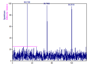Bei diesem Datensatz ist der größte Peak mit einer Sicherheit von mehr als 99,9 % bedeutsam. Dieser Test vergleicht nur die Komponente, die die größte Leistung hat, mit dem Gauß-Rauschen. Es kann hieraus kein Rückschluss auf die anderen Peaks getroffen werden.
