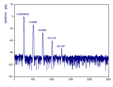 Obwohl es möglich ist, die Amplitudenwerte aus der Beschriftung abzulesen, ist dies keine gute Darstellung. Es wird eine logarithmische Skalierung benötigt, um den breiten Dynamikbereich der Amplituden sauber darzustellen.