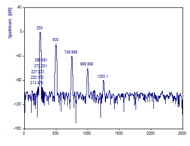 Die Abtastrate beträgt 5000 Hz, die Nyquist-Frequenz, die maximale Frequenz, die ausgewertet werden kann, liegt daher bei 2500 Hz. Die Zeitwerte variieren von 0 bis 0,2046 bei einem Abtastintervall von 0,0002. Es wird 0,01 % weißes Rauschen hinzugefügt. Das führt zu einem Hintergrundrauschen bei einem Pegel von -100 dB bezogen auf den größten Peak.