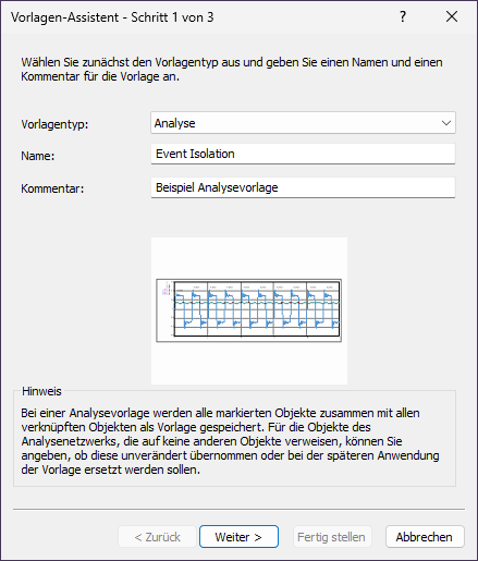 2.Der Vorlagen-Assistent öffnet sich. FlexPro wählt automatisch als Vorlagentyp Analyse, da zuvor ein Ordner bzw. mehrere Objekte markiert wurden. Als Vorlagenname wird der Ordnername und als Vorlagenkommentar wird der Kommentar des markierten Ordners übernommen. Belassen Sie die Vorgaben des Vorlagentyps und den Namen. Im Eingabefeld Kommentar tragen Sie Beispiel Analysevorlage ein. Klicken Sie nun auf Weiter.
