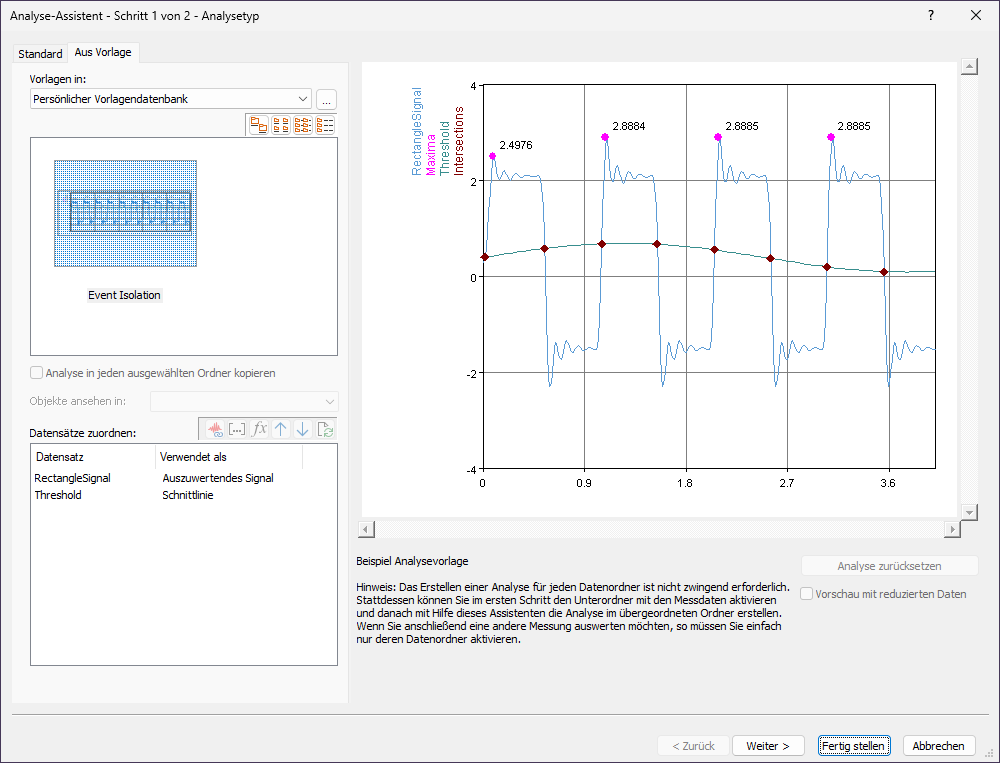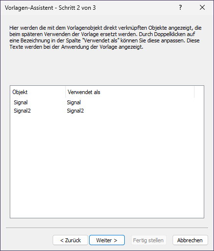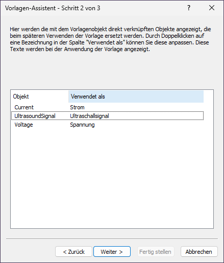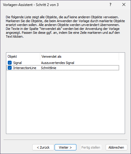 4.In der Spalte Verwendet als können Sie durch Doppelklick die Texte verändern, die beim Anwenden der Vorlage angezeigt werden sollen. Geben Sie für das Objekt Signal den Text Auszuwertendes Signal und für das Objekt IntersectionLine den Text Schnittlinie ein. Klicken Sie auf Weiter.