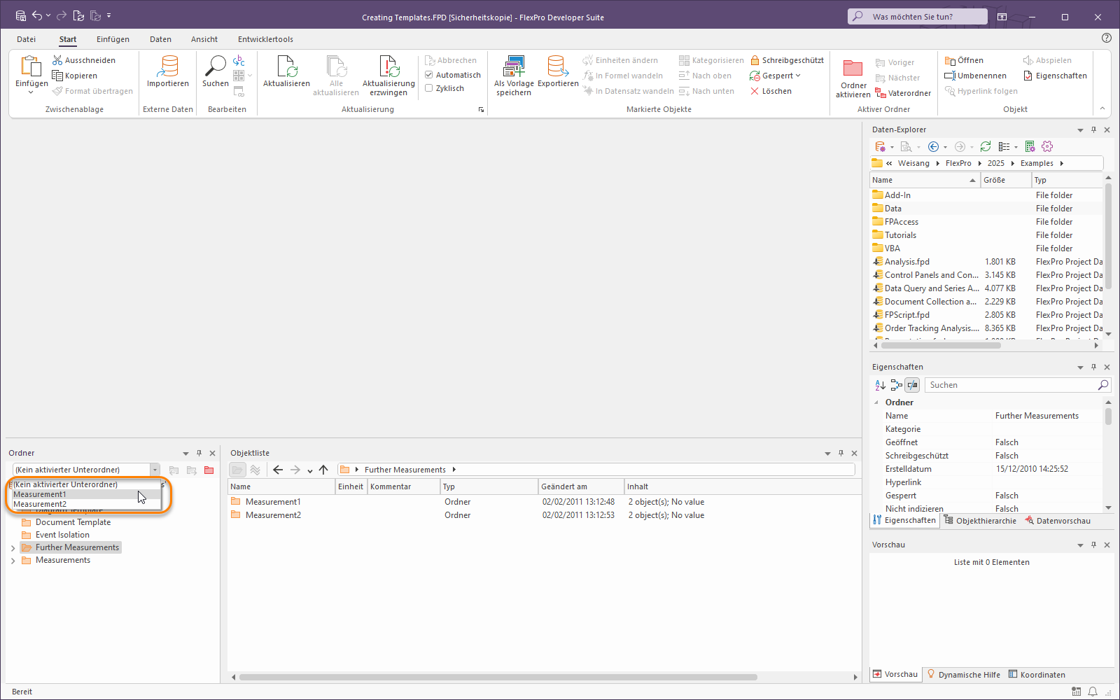2.Wählen Sie den Ordner Measurement1 im Listenfeld Ordner aktivieren in der Symbolleiste des Ordner-Fensters. Alternativ können Sie mit der rechten Maustaste auf den Ordner Measurement1 klicken und im Kontextmenü den Befehl Ordner aktivieren auswählen.