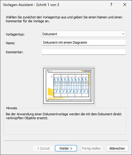 3.Wählen Sie als Vorlagentyp Dokument und geben als Name den Text Dokument mit einem Diagramm ein. Klicken Sie auf Weiter.