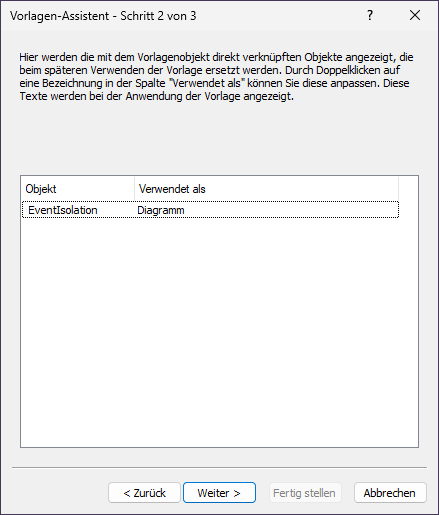 4.In der Spalte Verwendet als können Sie durch Doppelklick die Texte verändern, die beim Anwenden der Vorlage angezeigt werden sollen. Geben Sie für das Objekt EventIsolation den Text Diagramm ein. Klicken Sie auf Weiter.