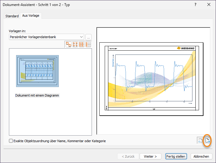 3.Wählen Sie dort unter Vorlagen in den Eintrag Persönlicher Vorlagendatenbank aus und markieren Sie die Vorlage Dokument mit einem Diagramm. Der Assistent erstellt automatisch ein Dokument. Klicken Sie auf Weiter.