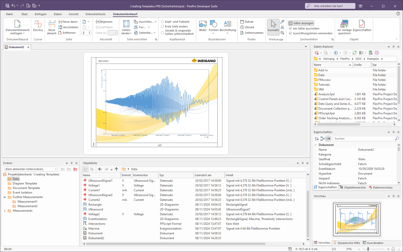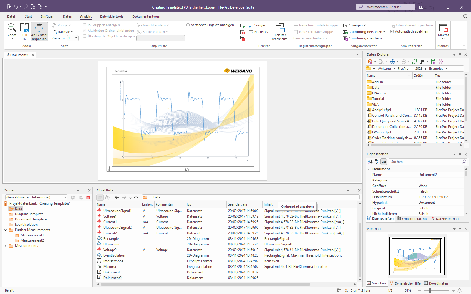 Öffnen Sie die Projektdatenbank. Wechseln Sie in den Ordner C:\Users\Public\Documents\Weisang\FlexPro\2025\Examples\Tutorials bzw. C:>Benutzer>Öffentlich>Öffentliche Dokumente>Weisang>FlexPro>2025>Examples>Tutorials.