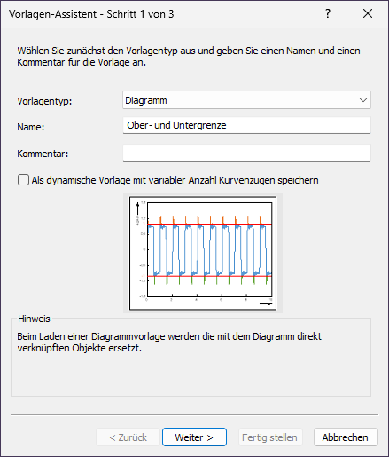 3.Wählen Sie als Vorlagentyp Diagramm und geben als Name den Text Ober- und Untergrenze ein. Deaktivieren Sie die Option Als dynamische Vorlage mit variabler Anzahl Kurvenzügen speichern. Klicken Sie auf Weiter.