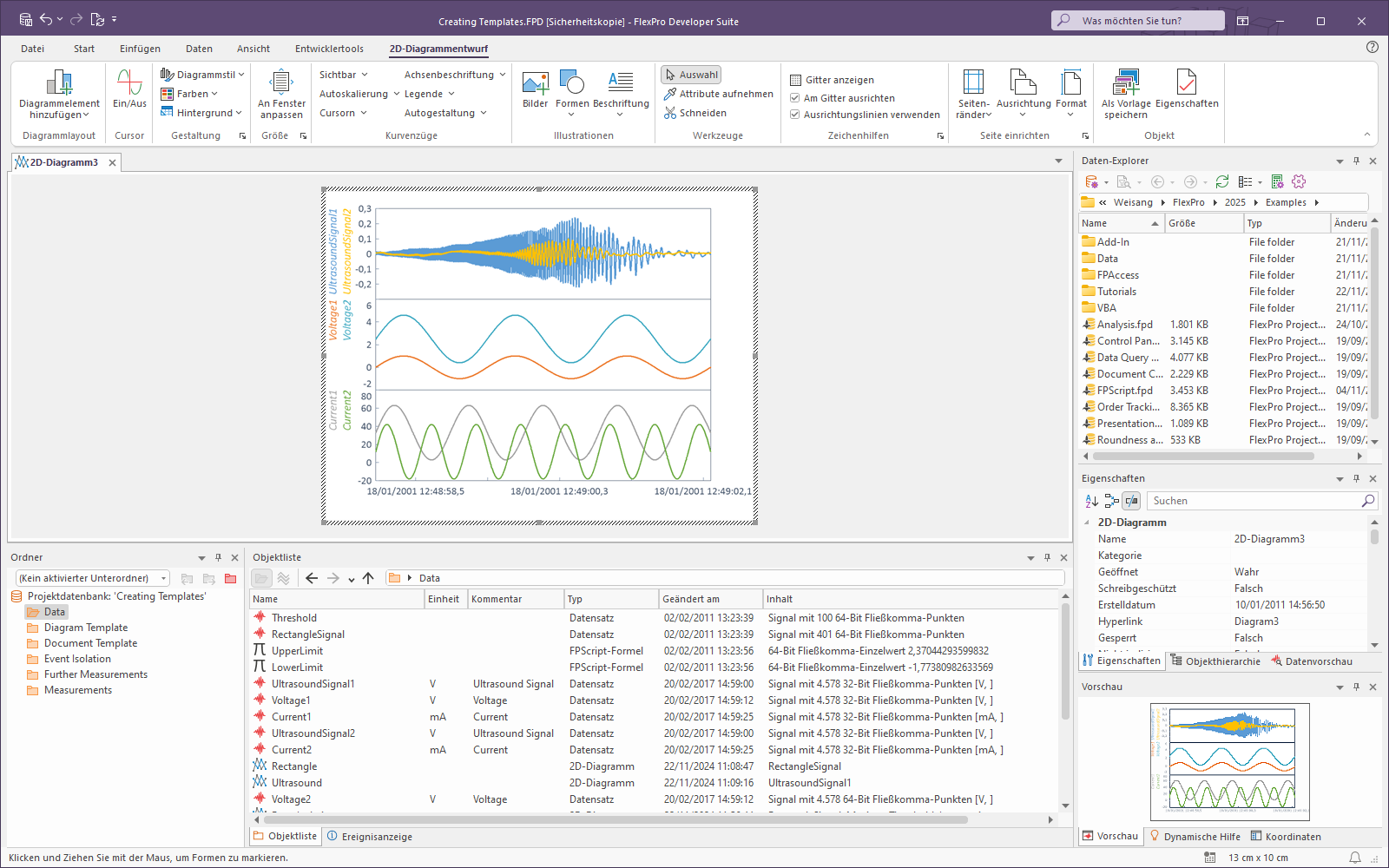 1.Markieren Sie nun im Ordner Data die Objekte Voltage1, Voltage2, Current1, Current2, UltrasoundSignal1 und UltrasoundSignal2 und wählen Sie anschließend Einfügen[Diagramme] > Diagramm-Assistent > Aus Vorlage.
