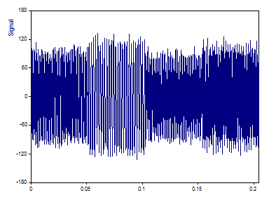 Die x-Werte (Zeit) variieren von 0 bis 0,2047 bei einem Abtastintervall von 0,0002. Die Nyquist-Frequenz ist daher 2500 Hz (Hälfte der Abtastfrequenz von 5000 Hz). Die vier Sinuskurven wurden mit folgenden Amplituden, Frequenzen und Phasen erzeugt: