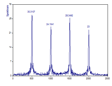 Als Spektrumtyp wählen Sie Amplitude. Als Fenstertyp wählen Sie Rechteck -13 dB W=1. Stellen Sie sicher, dass die FFT-Länge auf die Datensatzlänge oder 1024 gesetzt wird. Wählen Sie die Maximale Peak-Anzahl Option und geben Sie dort den Wert 4 ein. Setzen Sie anschließend Kritische Grenze Weißes Rauschen % auf Keine. Falls über den Peaks keine Beschriftungen sichtbar sind, klicken Sie auf Beschriftungen, bis die Amplituden-Beschriftungen erscheinen.