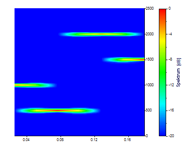 Diese Einstellungen produzieren sieben Zeit-Schnappschüsse, jedes mit der Länge 0,05 Sekunden. Es gibt 129 Frequenzen. Während bei den Frequenzen 500, 1000, 1500 und 2000 die Komponenten stark definiert sind, ist dies aufgrund der sequentiellen Eigenschaft der Harmonischen nicht der Fall für die Zeitachse. Da die Zeit, die einem Schnappschuss zugeordnet wird, außerdem die Zeit der Segmentmitte ist, gibt es an beiden Enden des Zeitintervalls einen ausgedehnten Bereich, für den keine Spektralinformation vorliegt.