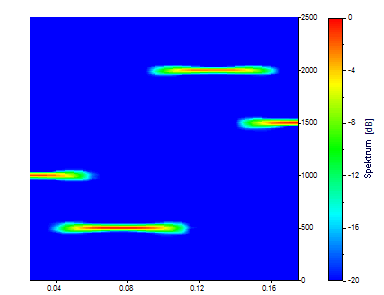 Die Optimierung der STFT-Parameter kann eine Herausforderung sein. Die STFT ist eine Analyse mit fester Auflösung. Die STFT erfordert zwar eine vorsichtige Feineinstellung der Parameter, andererseits kann ein STFT-Spektrum verwendet werden, um die Amplituden und Leistungen direkt als Höhen der Peaks abzulesen. Verwenden Sie entweder ein Bewertungsfenster und stellen Sie die Normierung auf Amplitude oder verwenden Sie ein Rechteckfenster in Verbindung mit sehr hoher Überlappung.